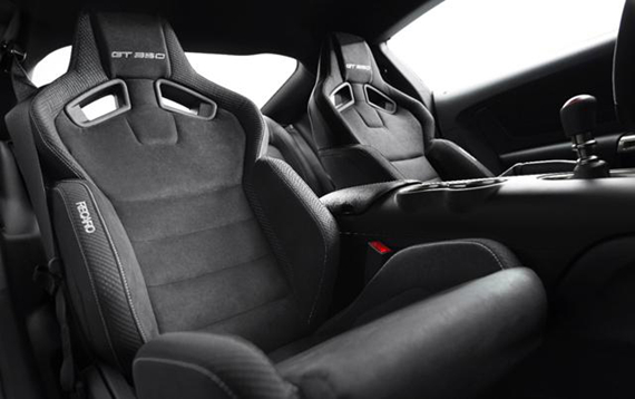 车内的运动化装备也很丰富,运动座椅肯定是必不可少的,而且双色设计很抢眼,同时一些碳纤维材料、翻毛皮革也加入进来呼应此车的性能和运动属性。