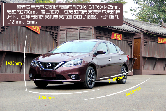 新轩逸车身尺寸的长宽高分别为4610/1760/1495mm,轴距为2700mm。相比老款,在轴距和宽度保持不变的情况下,在车身的长度和高度方面做出了调整,分别增加了21mm、8mm。与前脸大变身不同,新轩逸的侧面和尾部造型都基本沿用了老款设计,只是在一些细节方面做了调整,更加的精致。