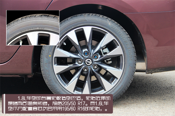 全新轩逸1.8L车型的专属轮毂造型巴适,轮胎选择的是普利司通泰然者,规格205/50 R17。而1.6L车型不分配置高低均会采用195/60 R16的轮胎。